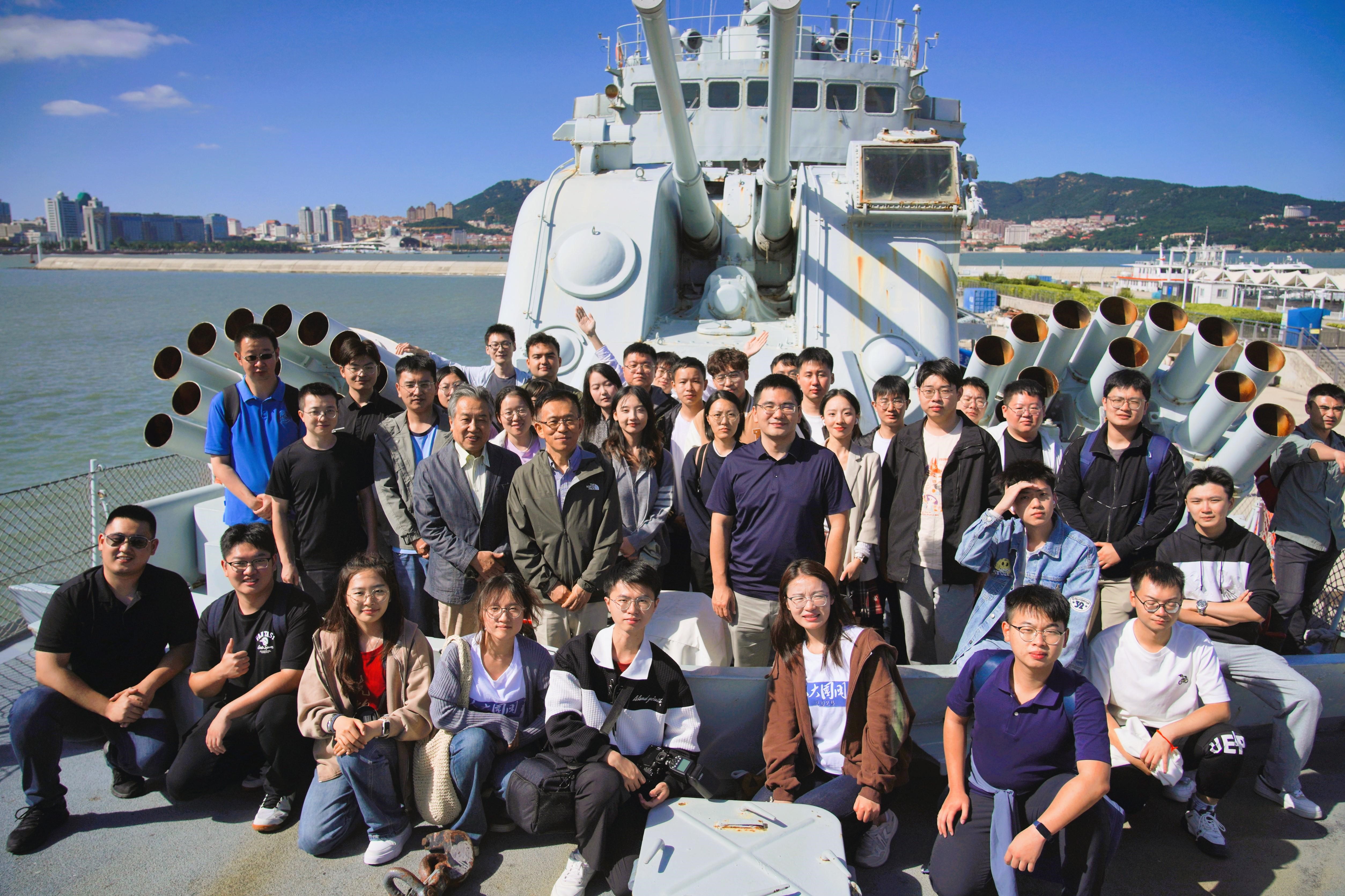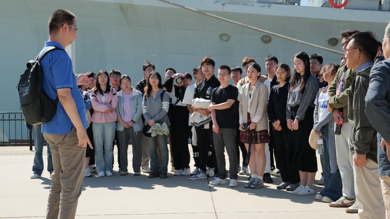 甲午海战后,清政府和国民政府虽然也不断尝试重建和发展海军,但都以失败告终。1949年后,中国的海军发展在中国共产党的领导下得到了长足的发展。为了进一步让参访同学们感受到中国海军军事武器的发展变化,更加直观地进行爱国主义教育,师生一行参访2019年退役的051型导弹驱逐舰大连号。李晨老师介绍了大连舰光荣的服役历史,指出该驱逐舰隶属于中国自行设计建造的第一代导弹驱逐舰,曾作为北海舰队旗舰,执行多次重要海上任务,为维护我国海防、国家安全和主权完整做出卓越的贡献,功勋卓著。老师同学们登舰参观,近距离观察大连舰的各式武器装备和船员生活状况,感受大连舰作为中国自主设计建造的第一代导弹驱逐舰的重要国家安全意义和其肩负的维护国家安全的沉重责任。